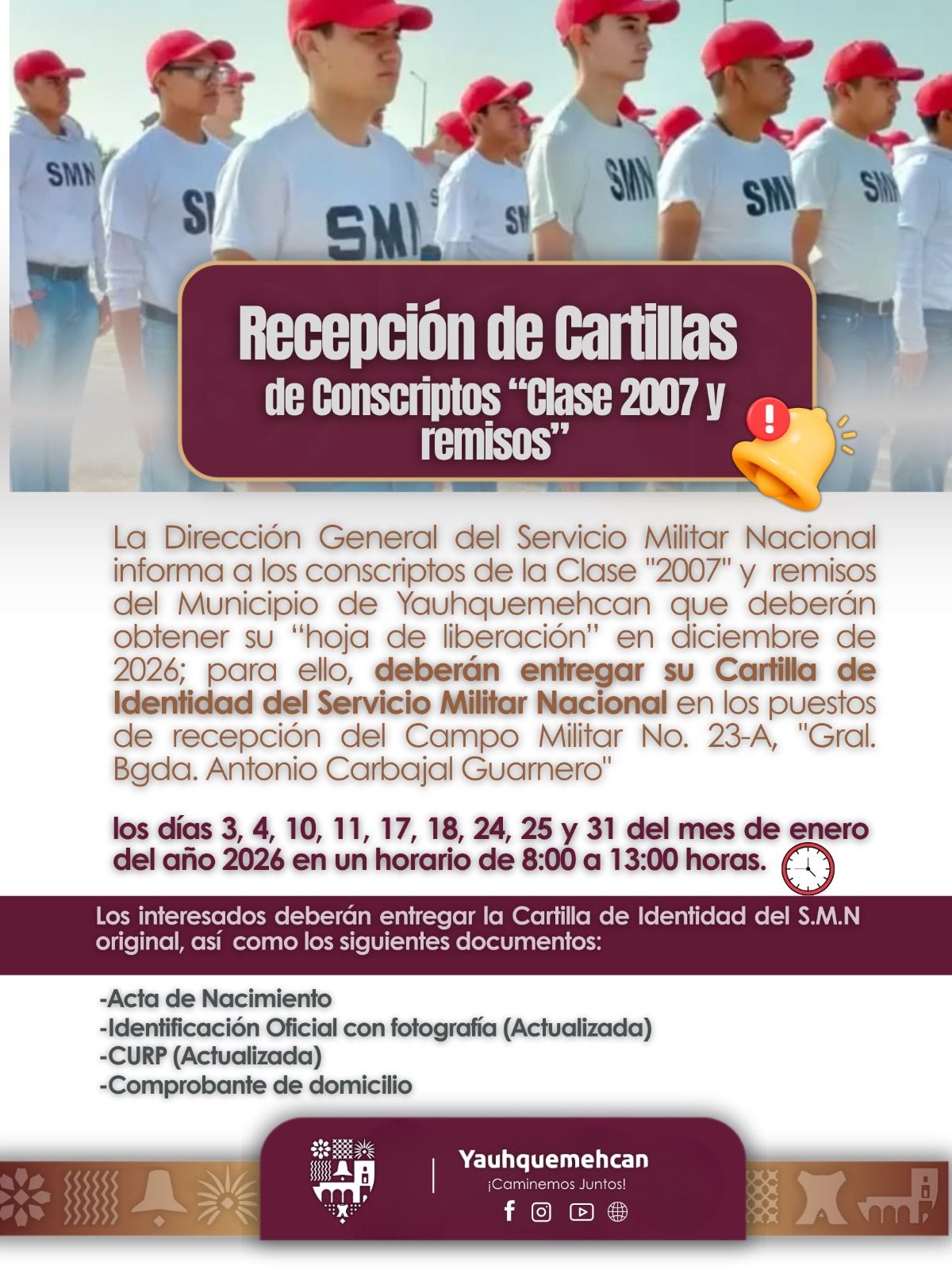 Leer másLa Dirección General del Servicio Militar Nacional a través del Ayuntamiento de Yauhquemehcan informa a los conscriptos de la Clase «2007» y remisos del Municipio de Yauhquemehcan que deberán obtener su “hoja de liberación” en diciembre de 2026; para ello, deberán entregar su Cartilla de Identidad del Servicio Militar Nacional en los puestos de recepción […]