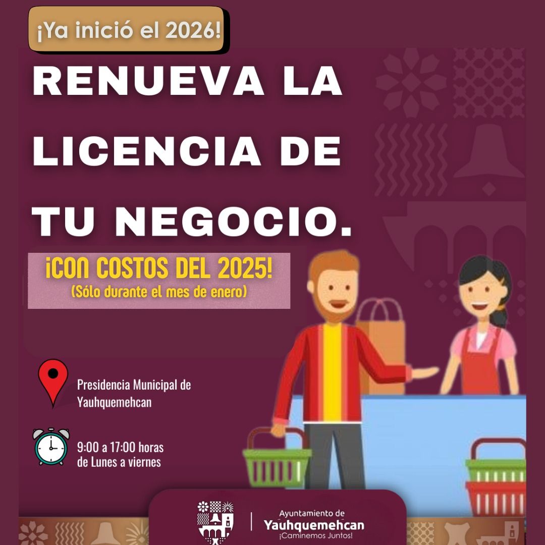 Leer másLa Coordinación de Desarrollo Económico te invita a aprovechar los grandes beneficios para este mes de enero del 2026. Acércate a las oficinas que se encuentran en la Presidencia Municipal de Yauhquemehcan para el refrendo de tus licencias de funcionamiento, con costos del 2025. ¡No te quedes sin aprovechar estos grandes beneficios! Horario de atención […]
